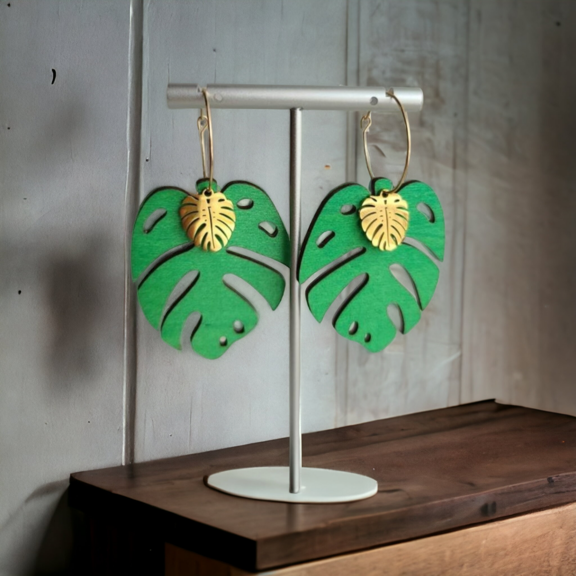 These gorgeous lightweight wooden monstera leaves have an intricate design and are set on a hoop and have a mini gold plated mini monstera for and accent detail.